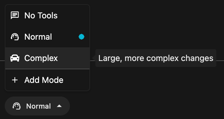 Simple, small-scope changes with AI making direct edits Makes targeted changes to specific files or functions. Handles bug fixes, small features, and basic refactoring. Example usage:Complex Mode